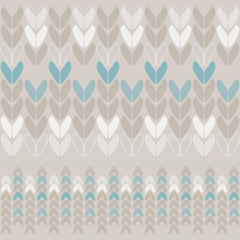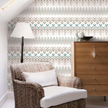 Muster in Braun, Weiß und Türkis auf beiger Vliestapete.