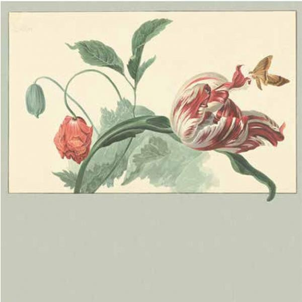 Mohnblume mit Schmetterling auf Vlies-Hintergrund.