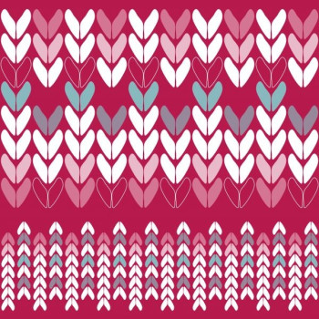 Muster in Weiß, Rosa und Türkis auf roter Vliestapete.