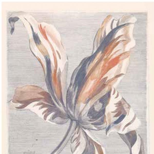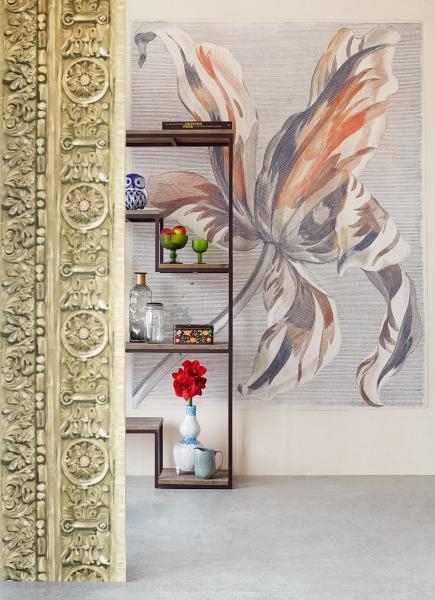 Blume in grau-beigem Farbton auf Vliestapete.