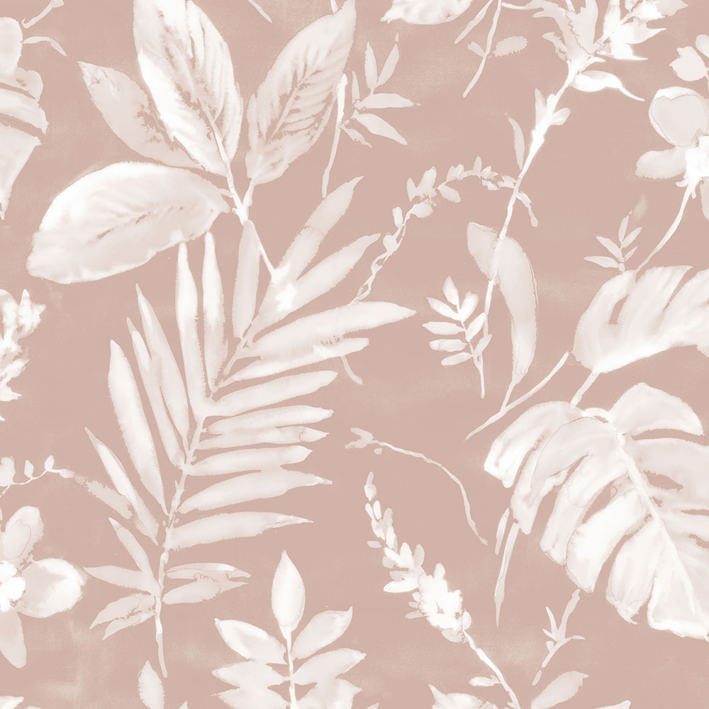 Vliestapete mit weißen Blättern auf einem altrosa Hintergrund.