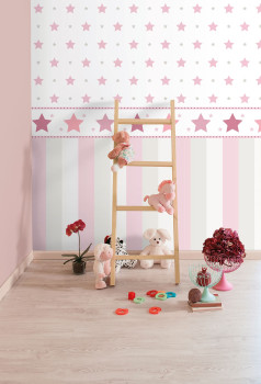 Gestreifte weiß-grau-rosa Papiertapete für Kinder.