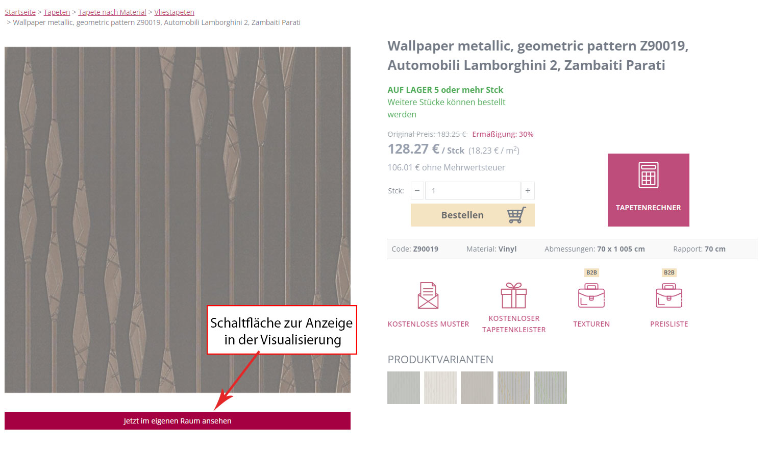 Produktdetailbild mit der Tapete, die Sie in der Raumvisualisierung sehen können