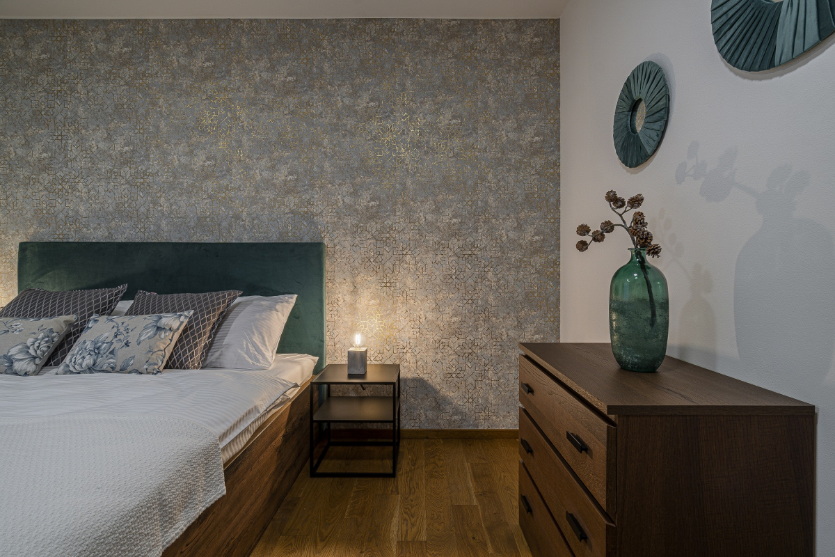 Wir sind der einzige Tapetenhersteller in der Tschechischen Republik und haben eine exklusive Wll-for-Kollektion voller Luxustapeten produziert. Werfen Sie einen Blick auf die Realisierung mit unserer wunderschönen, dezent metallischen Tapete Nr. 1257904 aus dieser Kollektion.